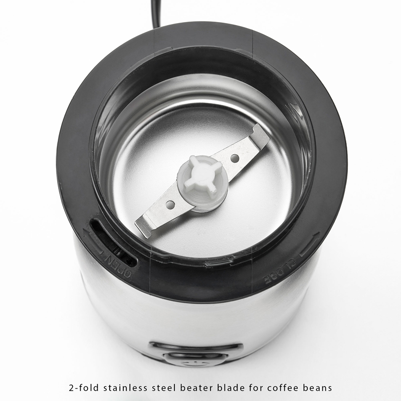 • Корпус з нержавіючої сталі • Місткість до 60 г кави в зернах • Ніж з нержавіючої сталі з 2 лезами • Контейнер для кавових зерен з нержавіючої сталі • Безпека - експлуатація можлива тільки із закритою кришкою • Кришка з вікном • Кнопка включення / вимикання (імпульсний режим ) •