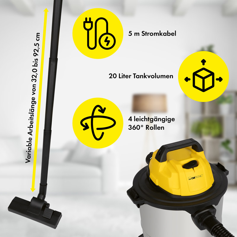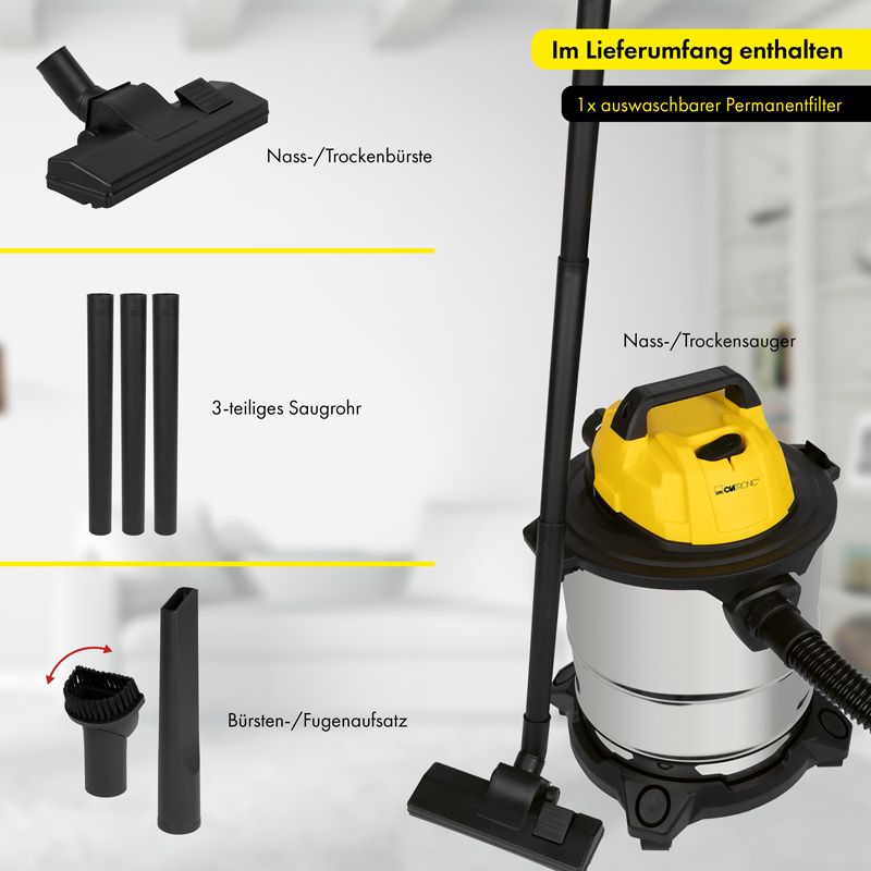 • Потужність, Вт: 1200 • Корпус із високоякісної нержавіючої сталі • Великий та зручний пилосос для сухого та вологого прибирання • Місткість бака 20 літрів • Висока потужність очищення та всмоктування: Волога (наприклад, пролиті рідини, вологий ґрунт у горщиках); Великий бруд (наприклад, листя, бите скло, тріска); Бруд (наприклад, пил на килимах або в машині) • Вкл. функція обдування (наприклад, для легкого видалення листя) • Всмоктувальна трубка, що складається з трьох частин, змінна робоча довжина від 32,0 до 92,5 см • 4 ролики з плавним ходом (360°) забезпечують гнучкість у роботі • Кабель довжиною 5 м для великого радіусу дії • Бризгозахищений корпус двигуна • Захист двигуна від переливу за допомогою поплавкового клапана • Постійні фільтри, що миються • Практичний тримач аксесуарів на пристрої для зберігання та знаходження приладдя під рукою • Аксесуари: щілинна насадка, волога/суха щітка, всмоктувальна трубка з трьох частин, постійні фільтри, що миються •