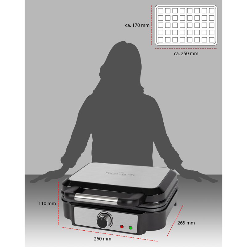 • Вафельниця для традиційних бельгійських вафель • 2 великі поверхні для випікання, кожна прибл. 25,0 x 17,0 см (з антипригарним покриттям) • 2 квадратні вафлі для кожного процесу випічки • 3 вставки з нержавіючої сталі: кришка, ручка та передня частина • Підготовка за кілька хвилин • Термоізольована ручка • Плавне регулювання ступеня підрум'янення • 2 світлові індикатори живлення та нагрівання (випікання) • Дуже легке очищення: Поверхня для випічки з антипригарним покриттям, Закритий канал для захисту від переповнення вловлює надлишки тіста • Надійна підставка завдяки гумовим ніжкам • Захист від перегріву • Захисне відключення • Місце для зберігання шнура •